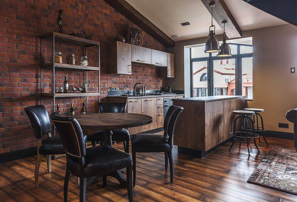 Укладка деревянного пола — весьма заманчивое и практичное решение. Осветленные или серые планки хорошо дополнят общее оформление. Выбирать для укладки следует террасную доску или ламинат наивысшего класса. Такие изделия максимально устойчивы к истиранию, обладают повышенной прочностью и надежностью. Декор из деревянных планок можно размещать и на стенах. К примеру, выделить ими можно центральную часть стенки возле обеденной группы. Такой прием подойдет для стилизации и обшивки оконного проема. Тон дерева должен соответствовать общей цветовой гамме, выбранной для отделки. Деревом можно горизонтально обшить 1/3 стенки над кирпичами (в зоне готовки или отдыха). Да и сам потолок (или его часть) могут обшиваться светло-коричневым, выбеленным деревом для создания уютной и комфортной атмосферы. Правда, обшивка из дерева несколько «съест» высоту стен. Такой вариант лучше использовать для помещений с высокими потолками.