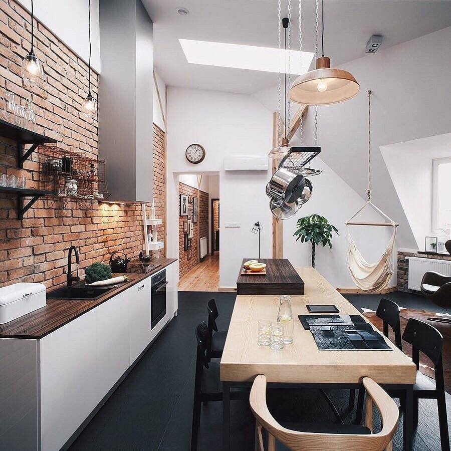 Еще один стоящий вариант – стена из красного кирпича, деревянная столешница и кухонный гарнитур, черные стулья, черная встроенная бытовая техника, стальные трубы.