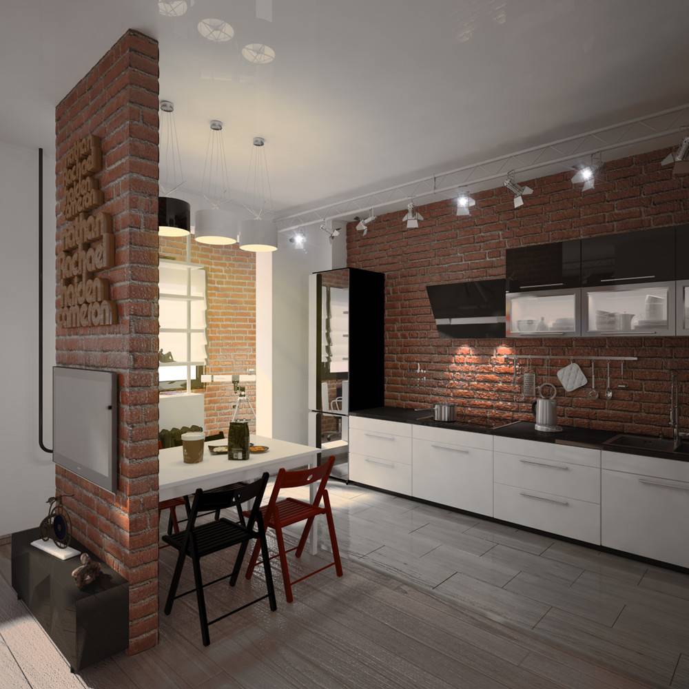 - Кирпич на стенах можно не отделывать вообще, но при желании всегда можно выбрать обои или даже фотообои, имитирующие отделку кирпичом. Только фартук нельзя оклеивать ни фотообоями, ни обычным материалом такого типа. Обои на любой основе не будут долговечными.