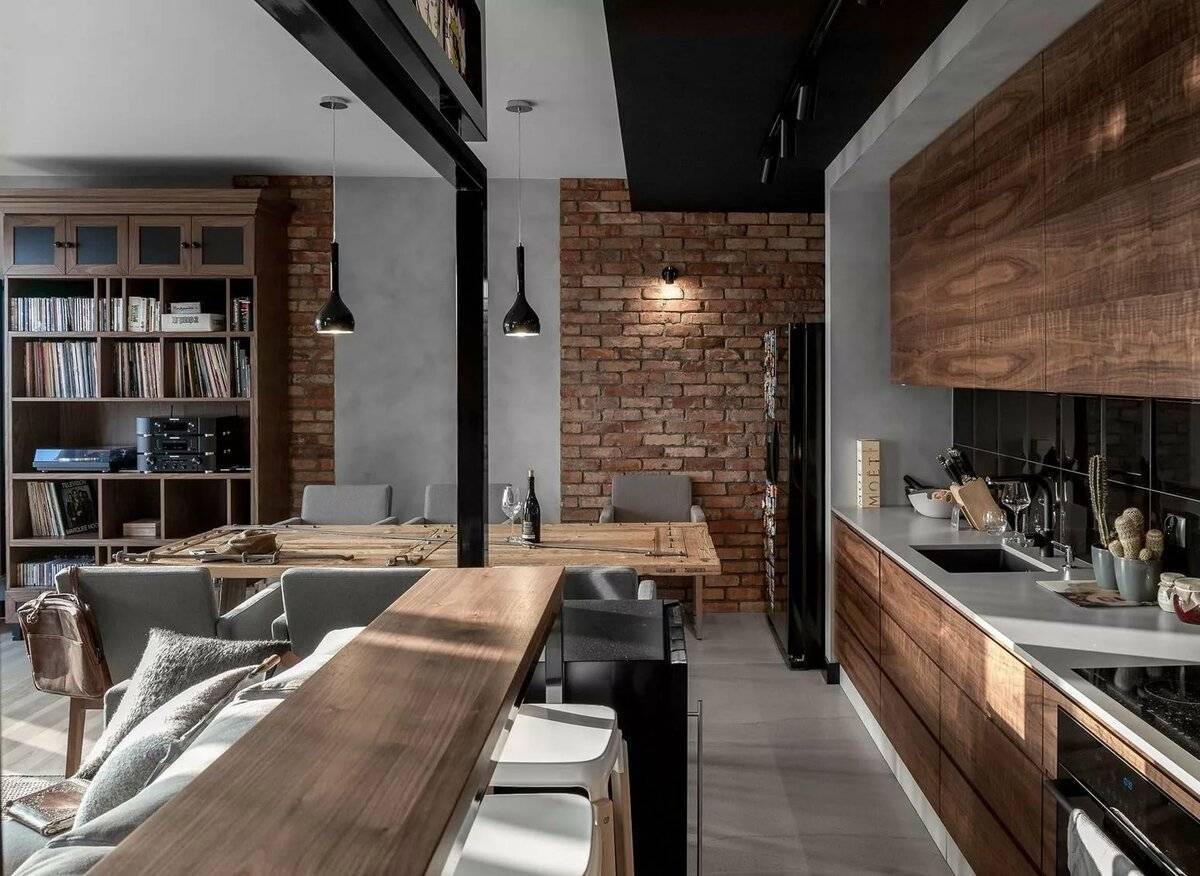 Темное дерево, кирпич и бетон – беспроигрышное сочетание