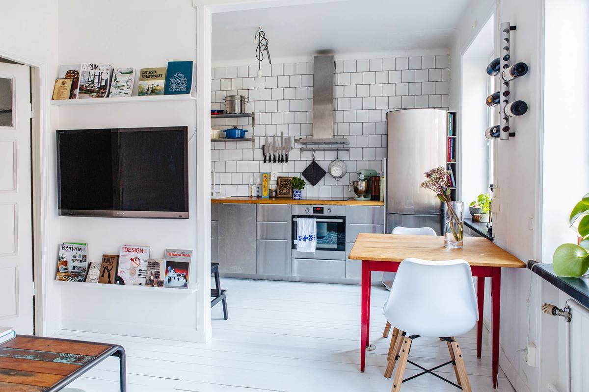 Создать чувство свободы. Вместо навесных шкафов с дверцами лучше расположить открытые навесные полки