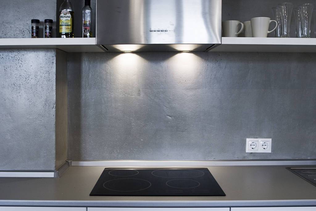 - стальная облицовка, о которой писалось выше (но помните, что её нужно будет почаще драить, чтобы она смотрелась красиво). Либо крашеный бетон.
