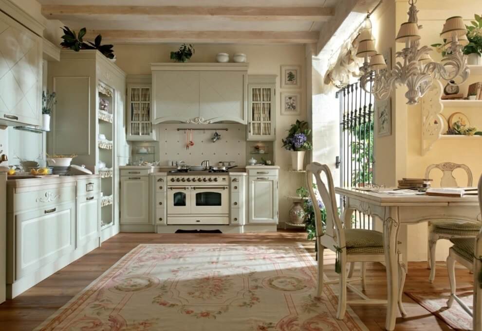 Для отделки пола в кухонной зоне в стиле прованс наилучшим решением будет керамическая плитка с эффектом потертости. Зоне отдыха подойдут более теплые варианты – ламинат, паркет или просто ковер поверх плитки.