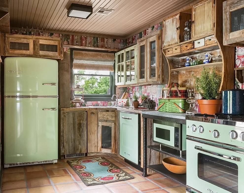 Не стоит выбирать современную бытовую технику под этот стиль. Печь холодильник и другие «блага цивилизации» должны не выбиваться из общего настроения дизайна.