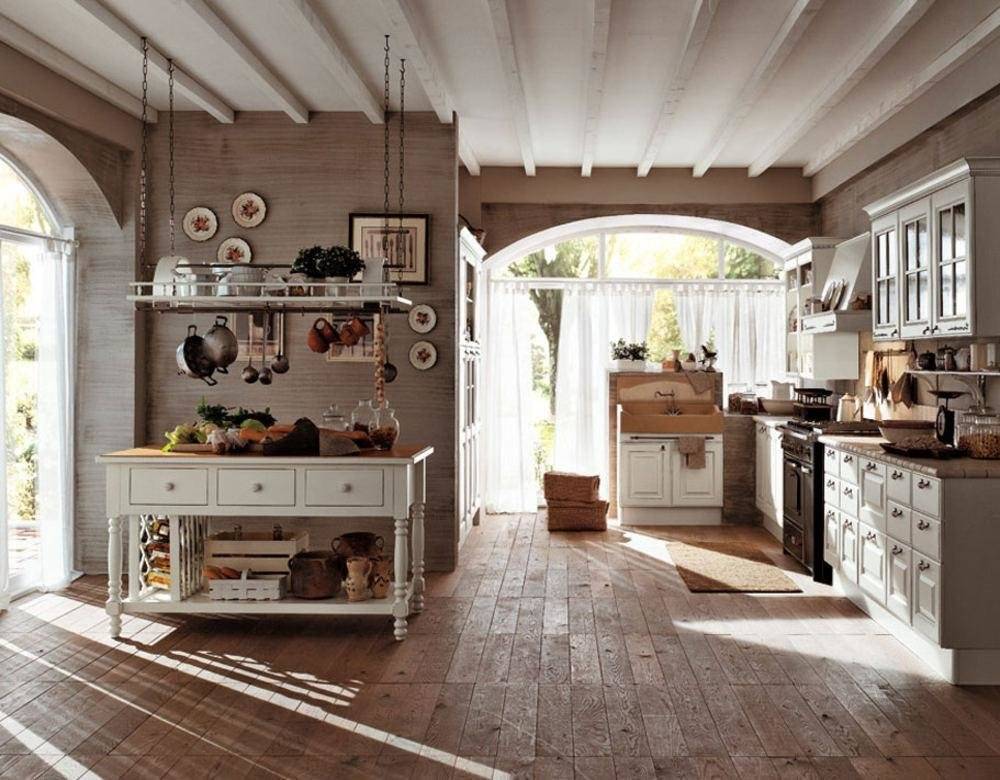 В отличие от стен, пол, как и потолочные балки, может быть темным. Но чаще всего это – светлое покрытие в тон стен или пол древесной расцветки, гармонирующий с оконными рамами, потолочным балками, дверными проемами или рабочими поверхностями.