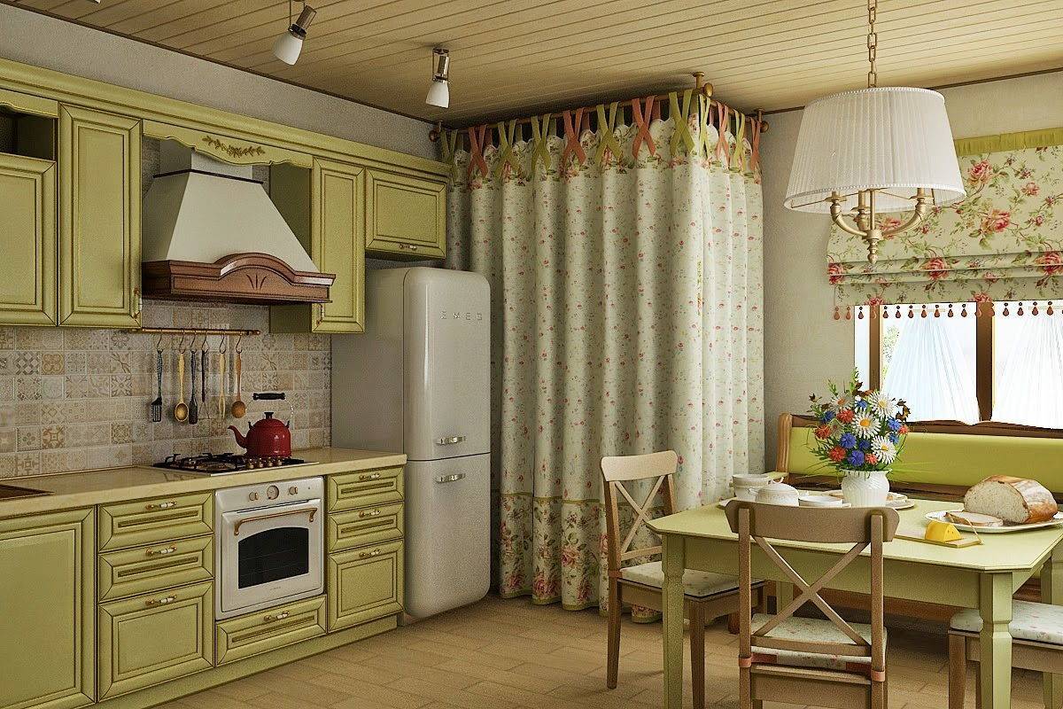 Особенность домов французской деревни это большое количество поступаемого солнечного света в комнаты, в том числе и на кухню. Чтобы этого добиться нужны большие окна, а чтобы они не быль голыми их обрамляют шторами-кафе или массивными шторами с подхватом.