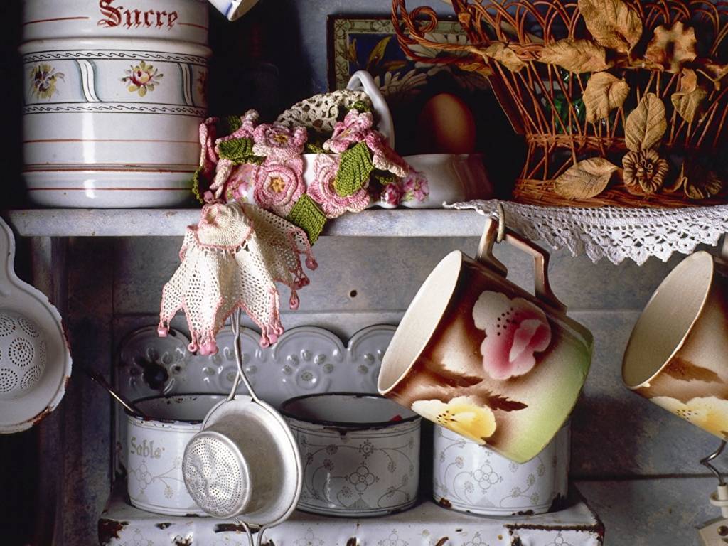 На кухне в прованском стиле открытые полки могут сочетаться с закрытыми шкафами, в которых, как правило, хранится посуда и часто используемые вещи. Полки же можно использовать для декоративных элементов, например, сервизов или расписных тарелок.
