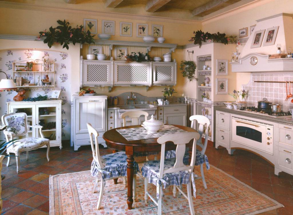 Обеденный стол имеет сакральное значение, ведь это место где собирается вся семья, на ритуал совместного ужина. Поэтому стол должен быть большим, прочным и выполнен из дерева. Чтобы у хозяйки был доступ ко всему необходимому — над плитой и по периметру комнату подвешены шкафчики для хранения посуды, которая становится частью декора и местом хранения приправ.