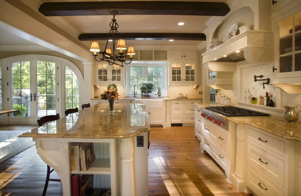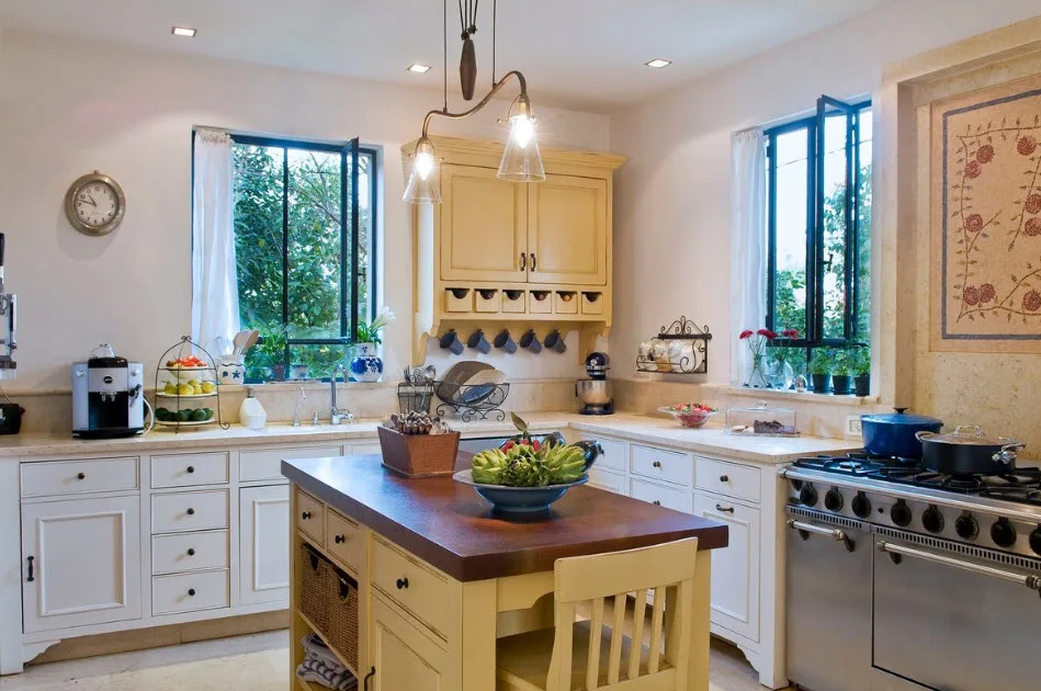 Стиль очень похож на прованс. Здесь также применяется максимум дерева в отделке фасадов, пола, потолка. Существует запрет на применение оргстекла и пластика в такой кухне. Кухонный фартук можно оформить плиткой с растительными узорами.
