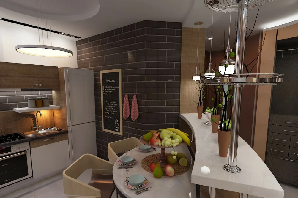 Отличным решением для небольшой квартиры будет объединение гостиной и обеденной зоны. Это позволит создать уютный уголок на скромной территории. Современный дизайн кухни гостиной часто представлен таким решением, когда часть мебели около обеденного стола заменяется уютным диваном. В этом случае в комнате необходимо найти место для телевизора.