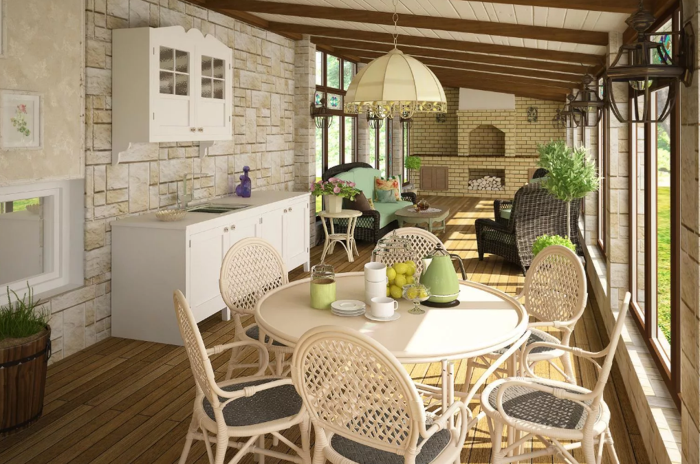 Для жарких месяцев можно сделать кухню на веранде. Дизайн такой кухни лаконичен, стилизован под внешний вид дома. Мебели мало, чаще всего она деревянная. Отдельным пунктом в оформлении такой кухни будет подведение коммуникаций. Нужно электричество, мойка с водой и канализацией.
