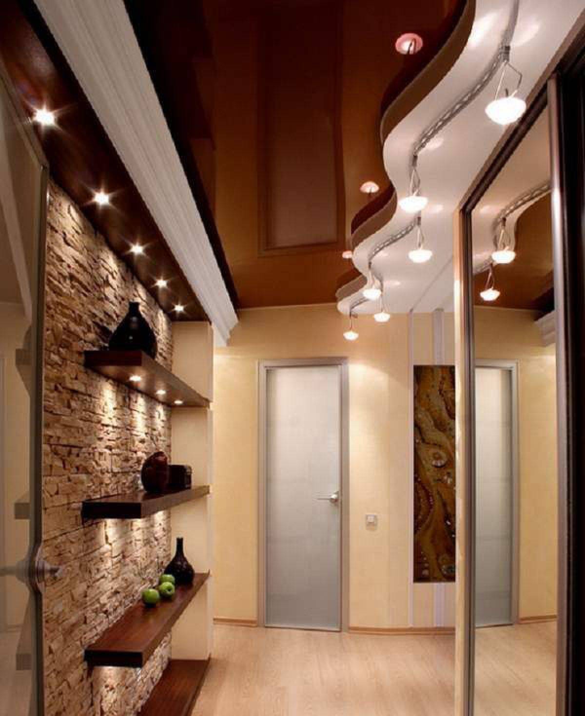 Очень интересен вариант подвесного потолка, состоящего из нескольких ярусов, с вмонтированными световыми окнами и системой освещения. В световых окнах матовое стекло может быть заменено на красочные эффектные витражи, которые не только украсят потолок, но и сделают коридор изюминкой квартиры.