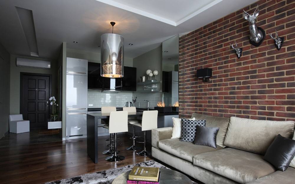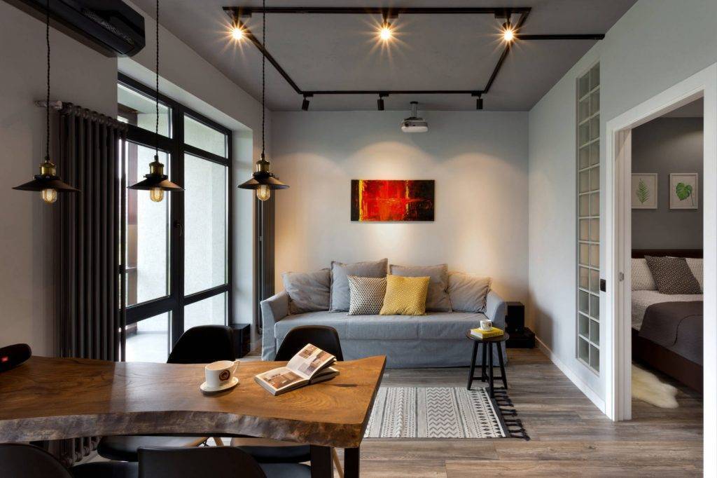 Если вы не нуждаетесь в большом количестве комнат, то дизайн вашего дома можно будет создать в стиле «лофт», когда все пространство разделено на зоны только визуально, без внутренних перегородок и дверей. Такой проект подойдет для семьи без детей или для проживания одного человека в квартире. Кроме того, стиль «лофт» предполагает наличие больших окон, пропускающих в помещение много света. Это делает интерьер светлым и позитивным, создает положительное настроение и привлекает большим простором, который можно создать даже в небольшом помещении на 60 кв. метров.