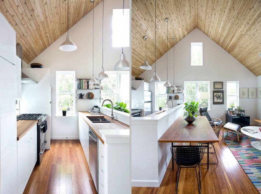 Открытая планировка кухни позволит вам реализовать мечту почти каждого современного человека – общественную зону с островом, большим диваном, двумя окнами и красивым дизайном интерьера