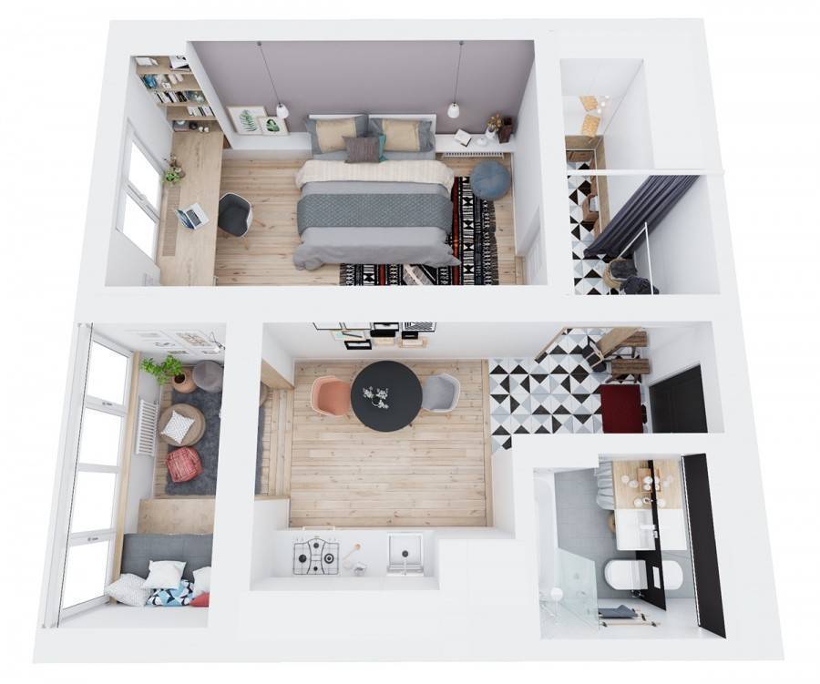 Стандартная планировка двухкомнатной квартиры современного типа выглядит так, как показано на фотографии выше. Здесь есть кухня, гостиная и отдельная спальня с гардеробом…