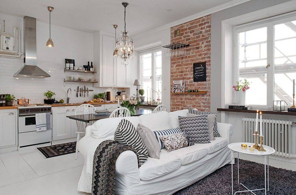 Отделка одной стены «под кирпичную кладку», тоже относится к разряду дизайнерских уловок и превосходно подходит ко многим стилям.