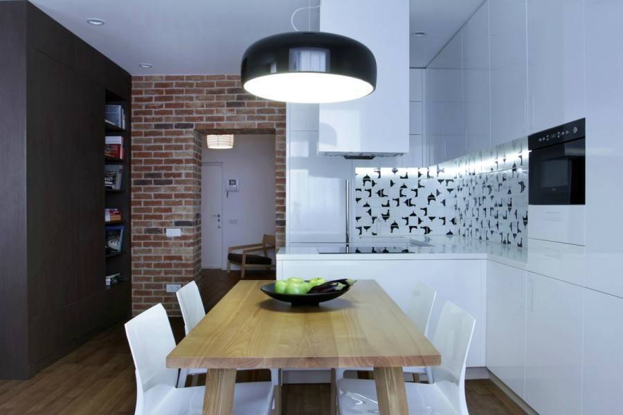 Чтобы разделить кухонную и гостевую зоны, возможно воспользоваться деревянной компактной перегородкой, которая послужит установкой под телевизионную технику.