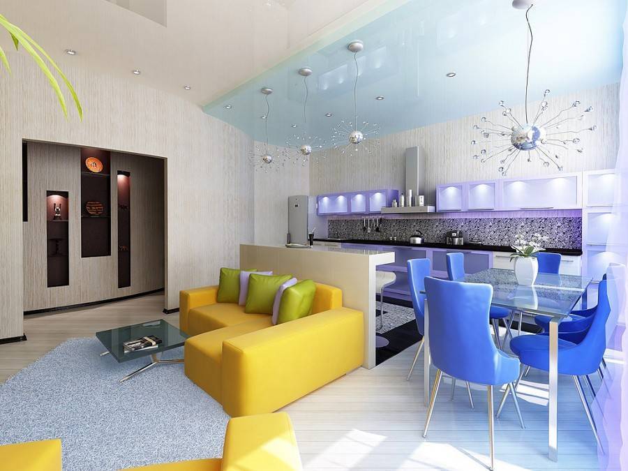 Используя легкие светлые тона вам удастся сделать квартиру намного шире и просторнее. Потолок желательно сделать белым, или использовать светло-голубой или розовый. Но никаких утяжеляющих элементов. Натяжной потолок также может быть удачно применен. За счет его поверхности имеем зеркальный эффект, что позволяет создать ощущение отсутствия потолка. Но желательно чтобы он также был светлого оттенка.