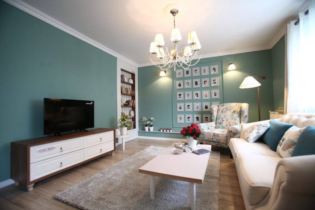 Когда жилище, площадью около 70 кв. м имеет всего две больших комнаты, с помощью цвета производится их зонирование. В гостиной место для семейных обедов будет отделяться от места отдыха другими цветами стен, пола, потолка. В детской разного цвета ковриками украсится пол в игровой, спальной, рабочей зонах. Когда выбираются различные оттенки одного цвета, то в спальнях, южных комнатках они должны быть на пару тонов темнее.