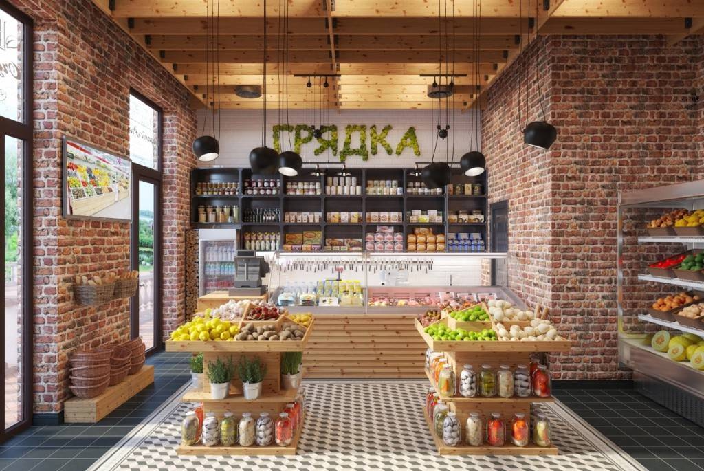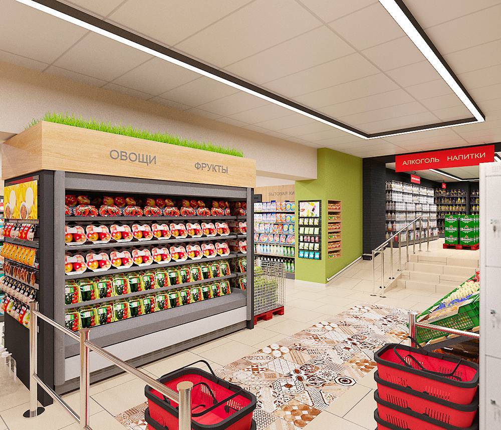 Внутреннее пространство продуктового магазина должно быть спланированно таким образом, чтобы клиенту было максимально удобно и комфортно, при этом поиск необходимых товаров не должен составлять проблем. В силу этого, необходим простой и функциональный интерьер, который не отвлекает клиента от покупок.
