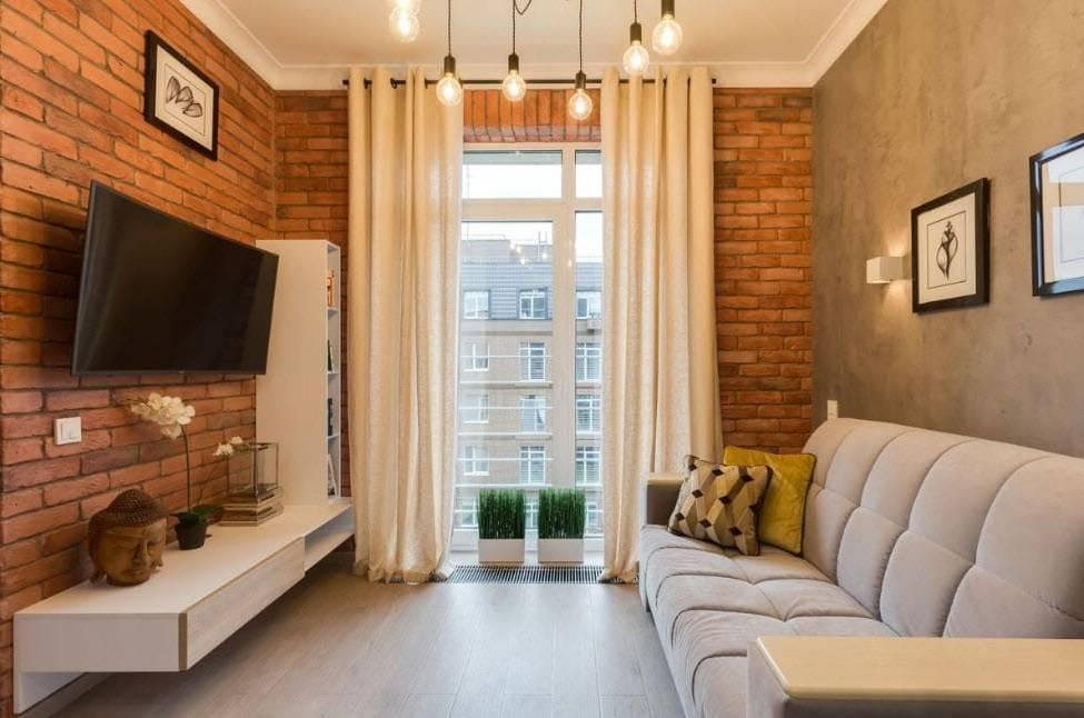 Промышленный стиль предполагает наличие свободного пространства, но и в небольшой гостиной ему можно найти применение. Достаточно подчеркнуть изысканность грубой отделки, сочетая состаренную мебель и ультрасовременную технику. Большие и открытые окна – большое преимущество, позволяющее грамотно оформить интерьер в стиле лофт.