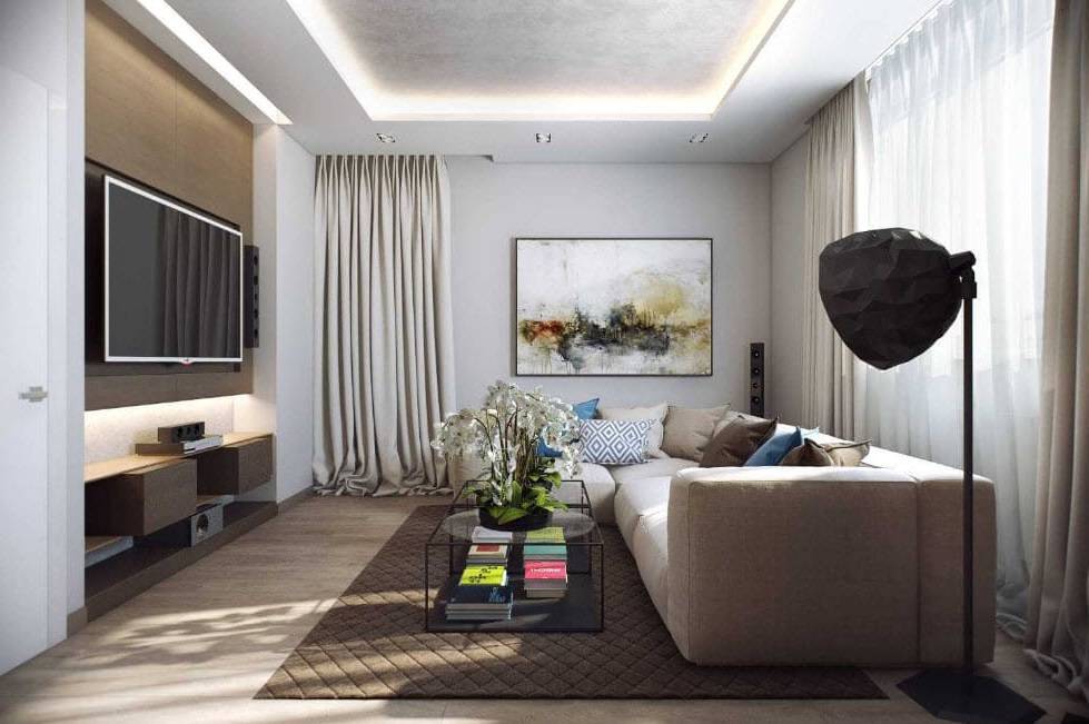 Сдержанный и современный интерьер покоряет своим уютом и наличием свободного пространства даже в маленьком помещении. Минимализм предполагает использование исключительно нужных и функциональных элементов, исключая декор. Основная цветовая гамма представляет собой белый и серый цвет, а также теплый бежевый оттенок с вкраплениями ярких деталей. Дополнить интерьер можно живыми цветами и абстрактными картинами, ярким текстилем и сложной системой освещения.
