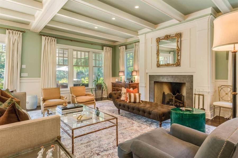 Открытые балки в комнате с каминомИсточник hgtv.com
