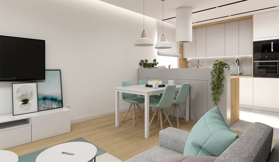 В гостиной используйте классические панели, которые намного дешевле, чем виниловые, не беспокоясь. Вы также можете выбрать деревянные доски. Убедитесь, что полы на одной высоте. Соедините их полосой пола, которая будет эстетично отделывать облицовку и сделает небольшую гостиную с кухней эстетически приятной.