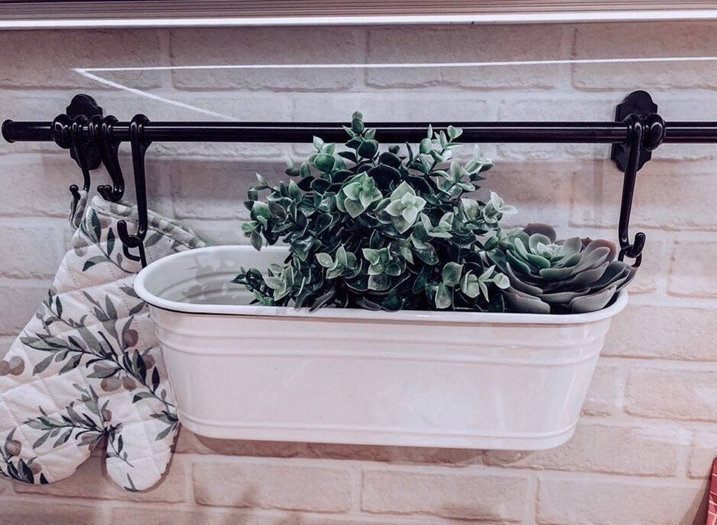 Третий способ подразумевает оптимизацию столешницы и пространства над ней, посредством специальных кухонных аксессуаров. Отличным помощником при этом выступить пристеночный рейлинг. Эта эффектная металлическая, трубка прикрепленная к стене, на специальных держателях, будет отличным местом для хранения различной кухонной утвари, при помощи различных приспособлений: крючков, корзинок и других держателей. На нем помещаются самые используемые аксессуары: слот со специями, половник, шумовка, лопаточки, прихватки, возле кухонной мойки на сетчатой корзине успешно разместятся моющие средства и вся атрибутика, а так же сушилка для тарелок. Это значительно повысит не только эргономику но и удобство кухни в процессе ее использования.