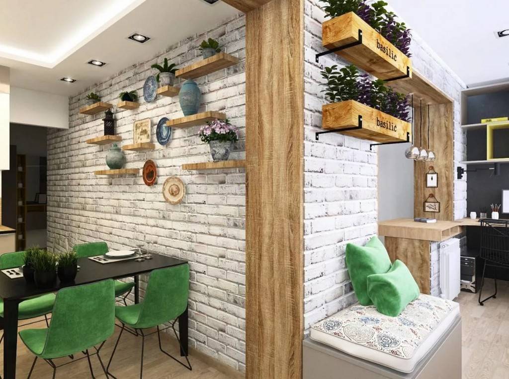 Обои выделяют обеденную зону с помощью насыщенного цвета и текстуры. Осветительные приборы также способствуют разделению пространства.