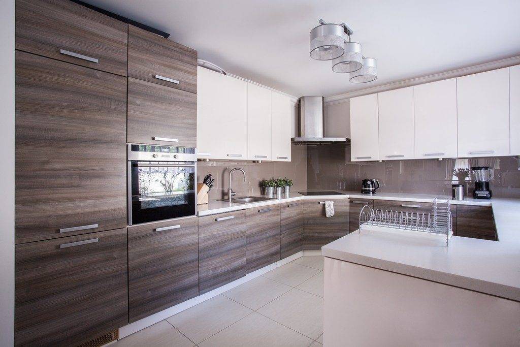 Обратите внимание! Зрительно увеличить высоту кухни можно с помощью комбинирования светлой отделки и темного пола, имитирующего дерево. Вместо деревянного пола можно также уложить плитку, которая должна быть темнее стен на несколько тонов.