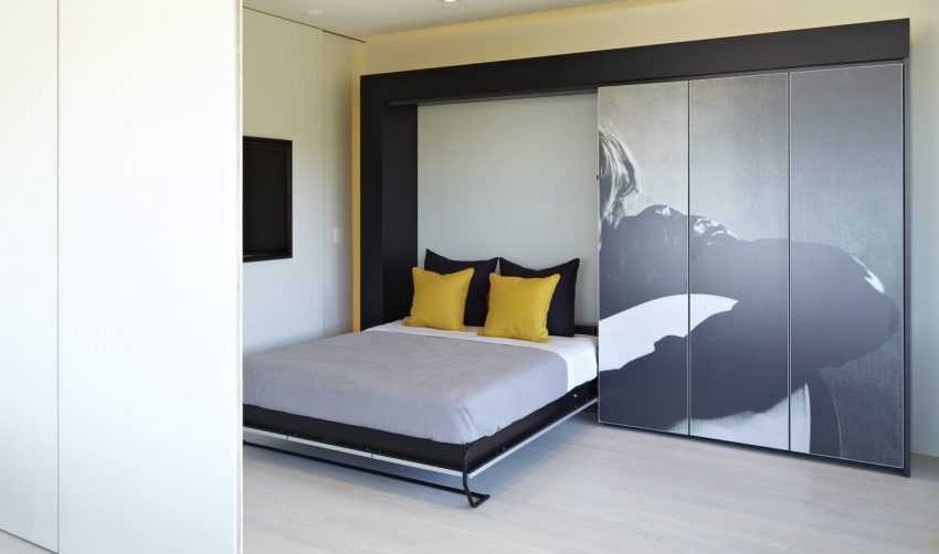 - Неплохим вариантом станет размещение в комнате модульного комплекта мебели со встроенной скрытой кроватью, которая раскладывается при подъеме и опускании ее каркаса. Кровать оснащена обычным ортопедическим матрасом, поэтому спать на ней будет вполне комфортно. Преимущество такого комплекта состоит и в том, что он занимает очень мало места, являясь при этом весьма функциональным.