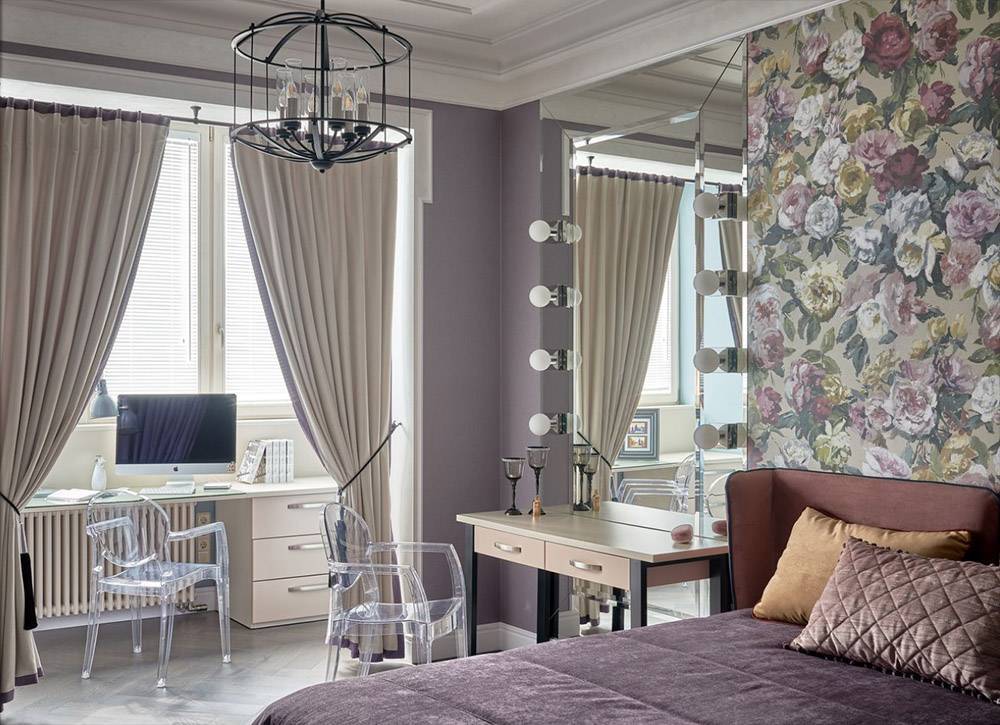 Соединение с будуаром является наиболее гармоничным вариантом. Предполагается наличие сегмента для сна и зоны, где женщина сможет разместить свою косметику, навести красоту. Кровать смотрится уместно. Не требуется убирать ее, чтобы освободить больше места.