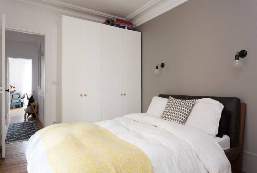 Если у вас есть возможность перенести массивный шкаф в коридор или гостиную, обязательно ею воспользуйтесь. Если же нет, постарайтесь сделать систему хранения менее заметной. Как это можно сделать? С помощью зеркальный дверей