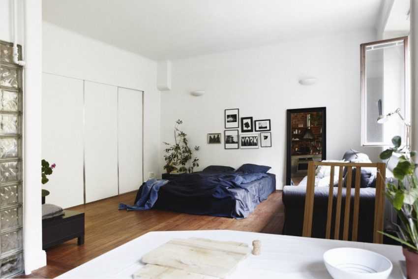 - В квартире-студии также можете предоставить место для маленькой спальни, используя даже раздвижные двери.