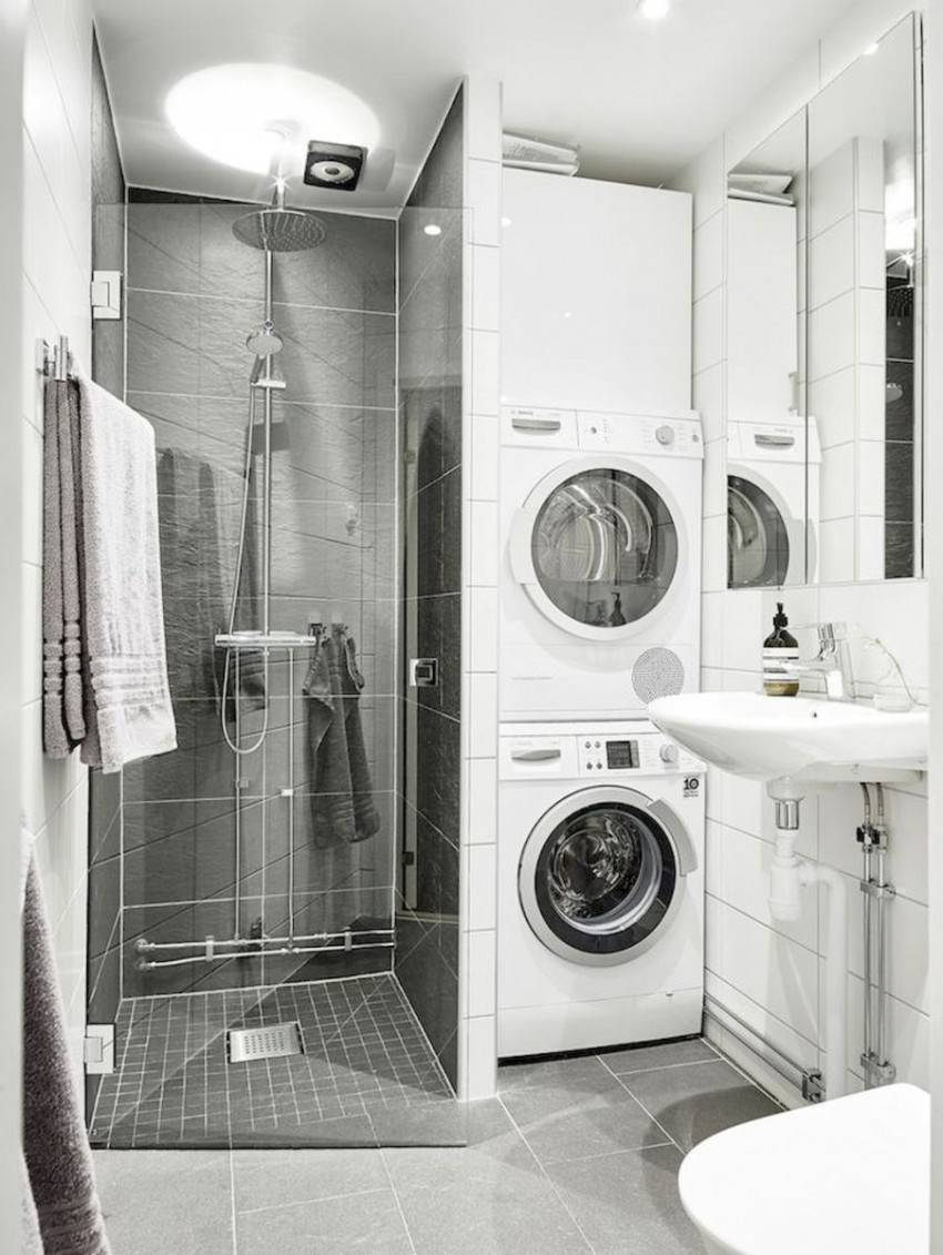 Душевая кабина может спасти положение и оставить место для бытовой техники и маленького шкафчика для хранения полотенец, химии и полезных мелочей, ее располагают в углу.