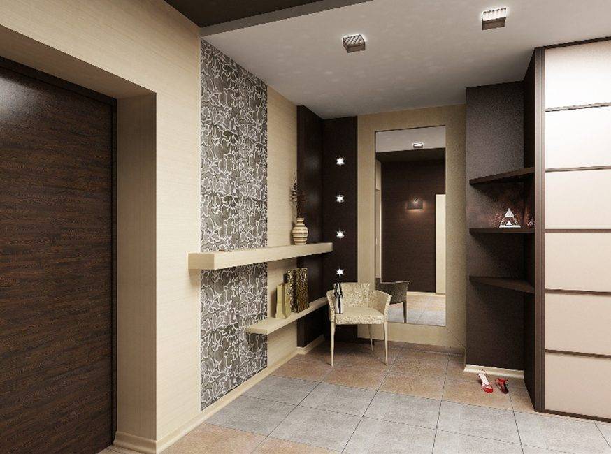 Помещение, которое дышит. Холодный тон напольной плитки в прихожей успешно “подружили” с теплым освещением и высокими зеркалами