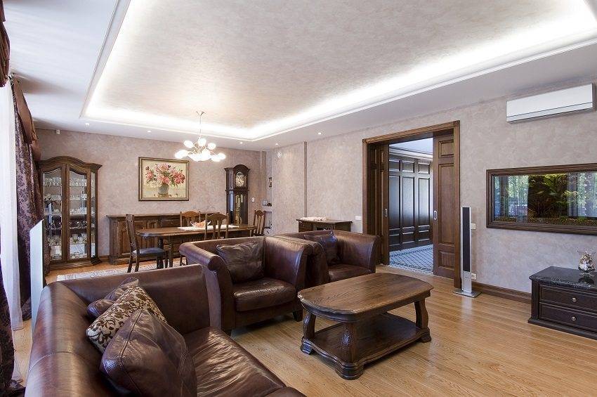 Беспроигрышный вариант – нейтральные оттенки подвесных натяжных покрытий. Тогда ваш зал не будет казаться перегруженным деталями и навязчивыми цветами.