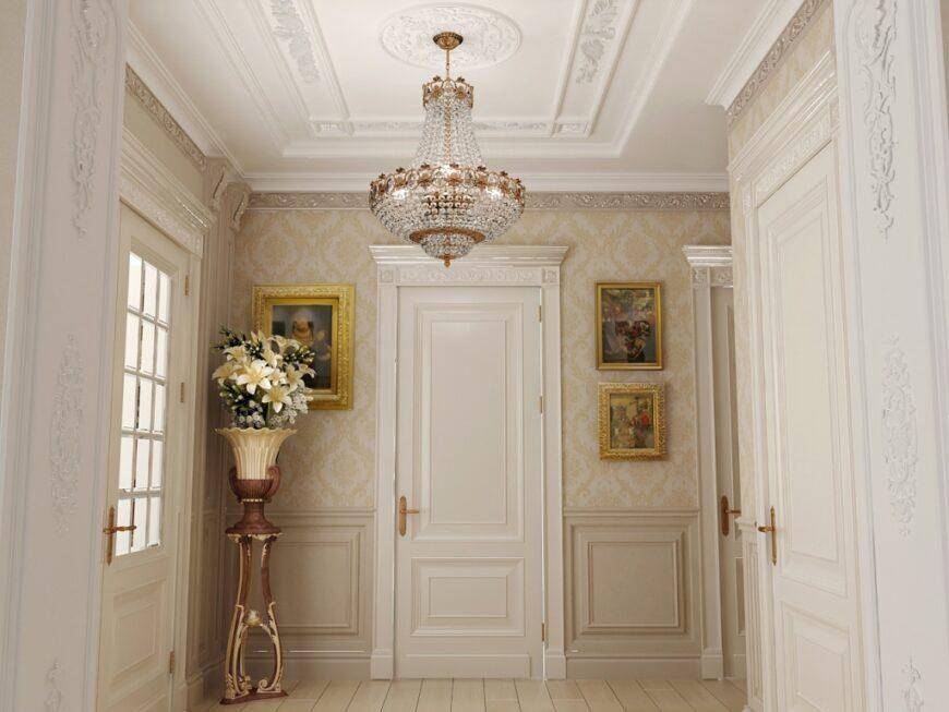 Слишком высокие потолки в коттедже можно зрительно укоротить, если разбить плоскость стен на 3 части. Это нижний уступ, широкая часть в центре и широкая полоса у потолка, как показано на фото обоев с рисунком. Кстати, этот прием будет смотреться роскошно, если в нижней части использовать имитацию мрамора или другого отделочного камня.