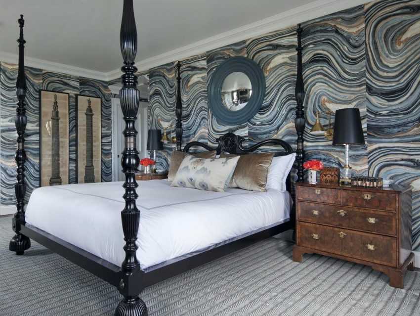 Сегодня многие дорогие материалы успешно имитируют в интерьере спальни красивые обои: