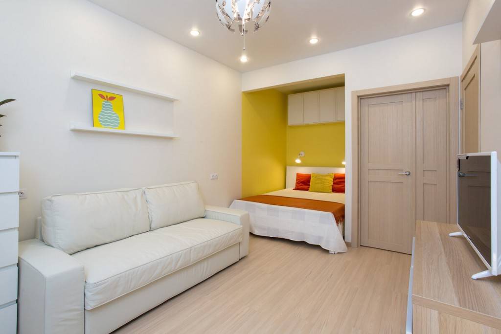 Обычно жилье реализуется в виде студии, однако никто не запрещает при этом обустраивать отдельную комнату. При необходимой сноровке и желании можно быстро перепланировать квартиру и получить две отдельные комнаты – гостиную и кухню.