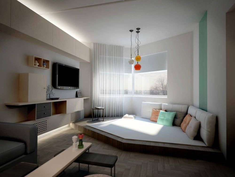 • В том случае, если помещение слишком невелико, а перепланировку сделать нет возможности, рекомендуем в качестве разделителя спальни и гостевой зоны использовать симпатичную занавеску, которая в дневное время станет элементом интерьера, а в ночное время поможет отделить спальное место красивой шторой.