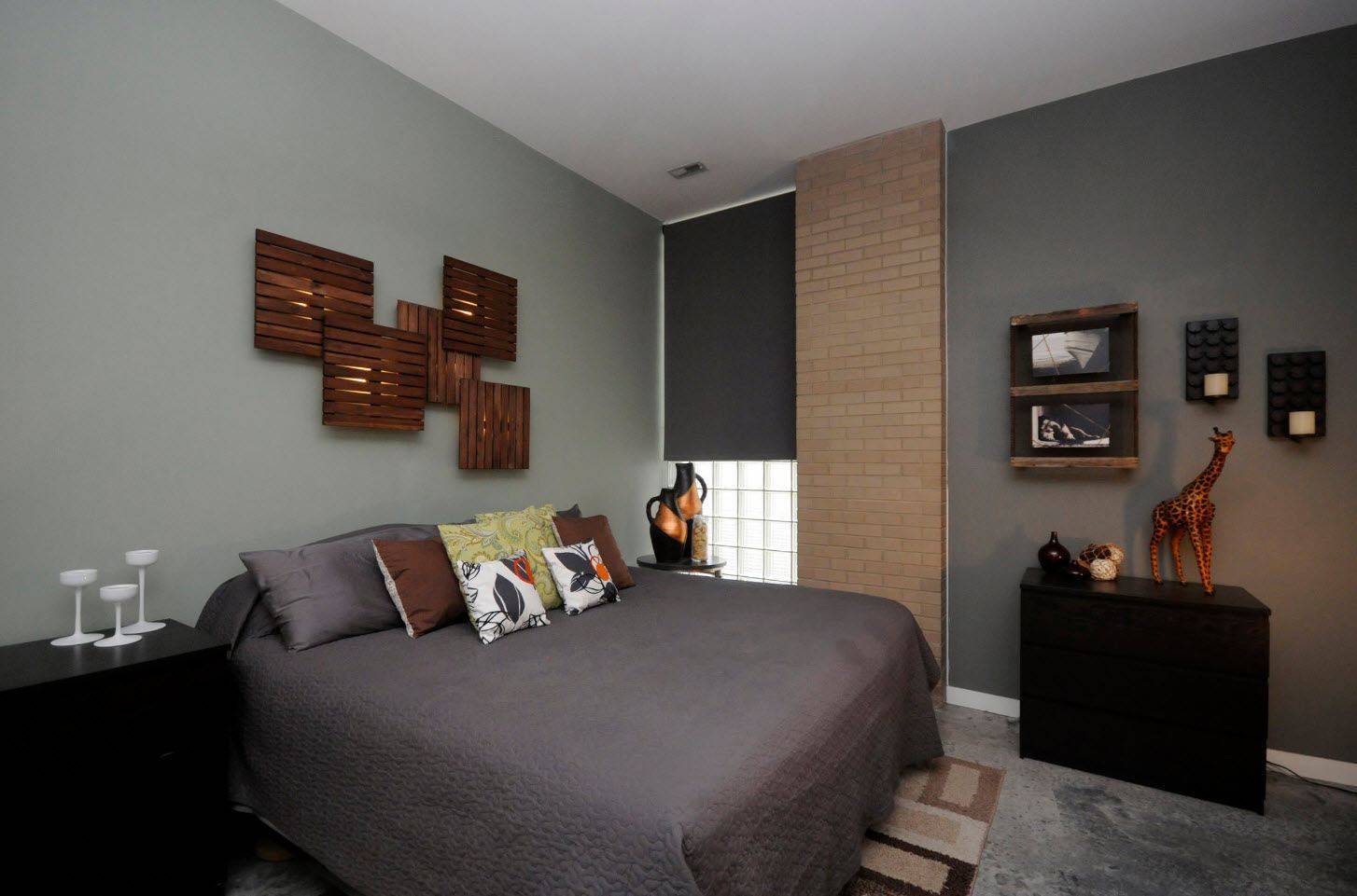 Тумбочки квадратной формы, приземистая прямоугольная кровать темного коричневого цвета, массивный комод. В сочетании с серыми стенами такая мебель смотрится весьма органично.