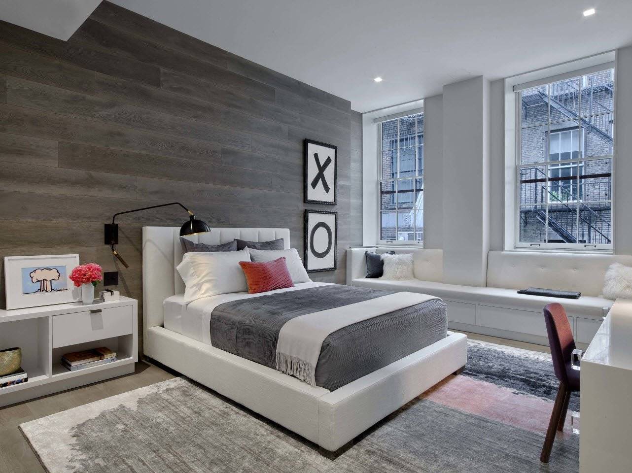 Главный предмет мебели в спальне — кровать. Независимо от размеров, кровать должна контрастировать со стенами. Например, если вы решили поклеить темно-серые обои, кровать или диван установите белого цвета. Если оттенки мебели и стен все-таки находятся близко друг к другу, поиграйте с цветовой гаммой постельного белья. Купите яркие подушки со стильным принтом, украсьте текстильные предметы любым другим способом. Если стены выкрашены в светло-серый цвет, остановите свой выбор на мебели более темных и ярких оттенков.