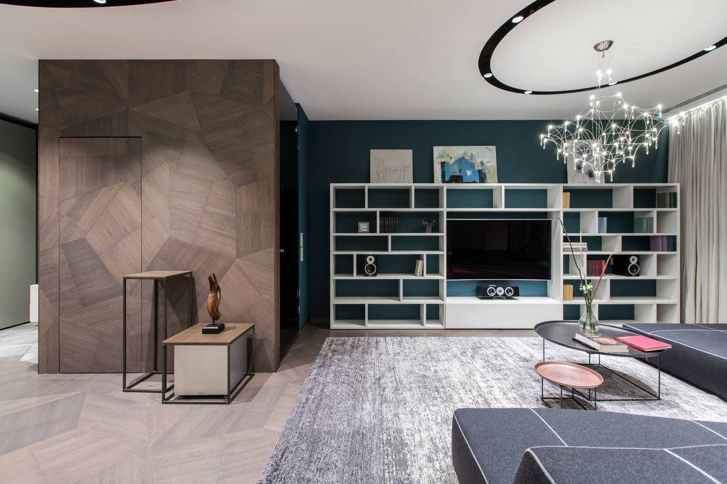 Яркие акценты бирюзовых оттенков в интерьере серой гостиной
