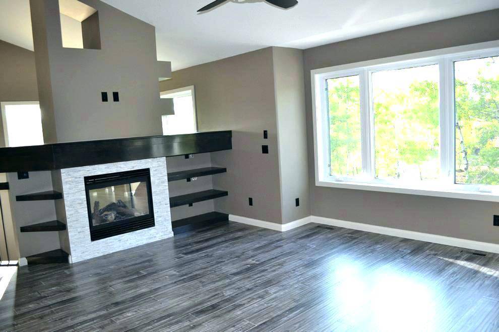 На фото современный интерьер в нейтральных оттенках с ламинатом и плиткой без плинтусов, белые стены увеличивают пространство.