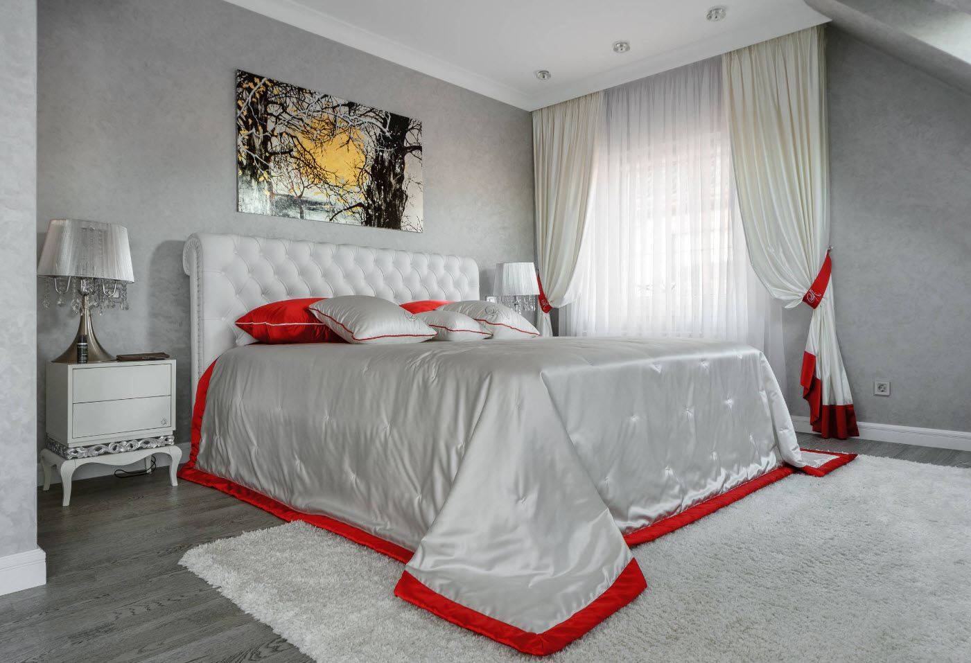 Так как серый относится к холодным цветам, не бойтесь выбрать роскошную, стильную, крупную мебель любого цвета, отличающегося от серого — гармония в такой спальне будет обеспечена, даже если вы еще не обзавелись дополнительными аксессуарами и прочими элементами интерьера.
