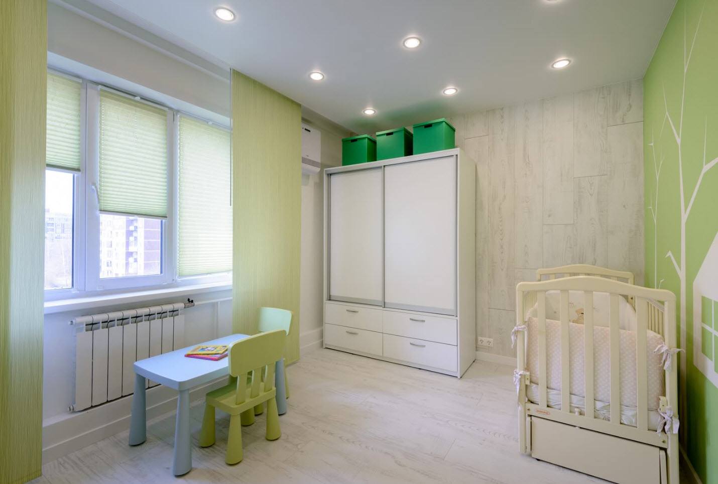 Акцент на фиолетовый часто делают творческие личности, которые имеют много интересов, и постоянно находятся в развитии. Восприятие оформления в синем и зеленом цвете, с присутствием белого пола, также зависит от подобранных оттенков. Оно может быть контрастным и броским с ярко-синим и сонным зеленым, или создавать впечатление романтичной и мягкой атмосферы при выборе нежного голубого и легкого салатового тона.