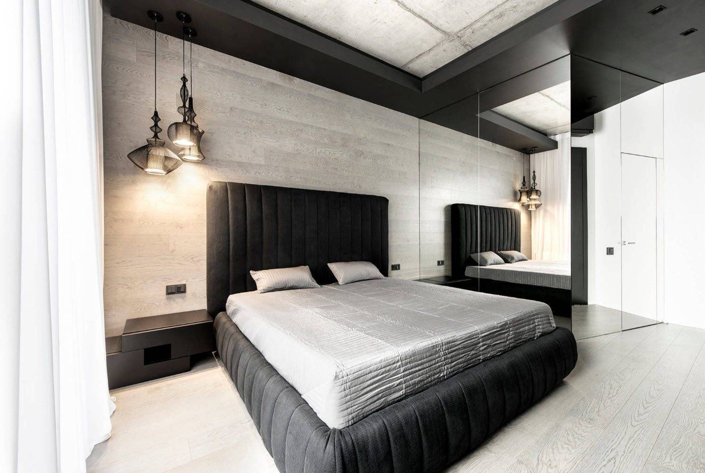 Конечно, не стоит и перегружать спальню лишними предметами, важно оставлять достаточно просторного места для надлежащего освещения. Что касается формы мебели, она должна быть строго геометрической
