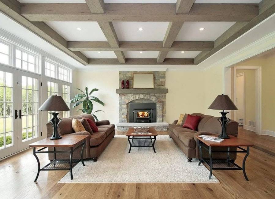 Выполняются такие потолки как из гипсокартона, так из деревянных, пластиковых, металлических панелей. Такой вид оформления гостиной больше подходит для стилей, направленных на натуральность или аскетизм, и придется по вкусу не каждому, но тоже имеет место быть.